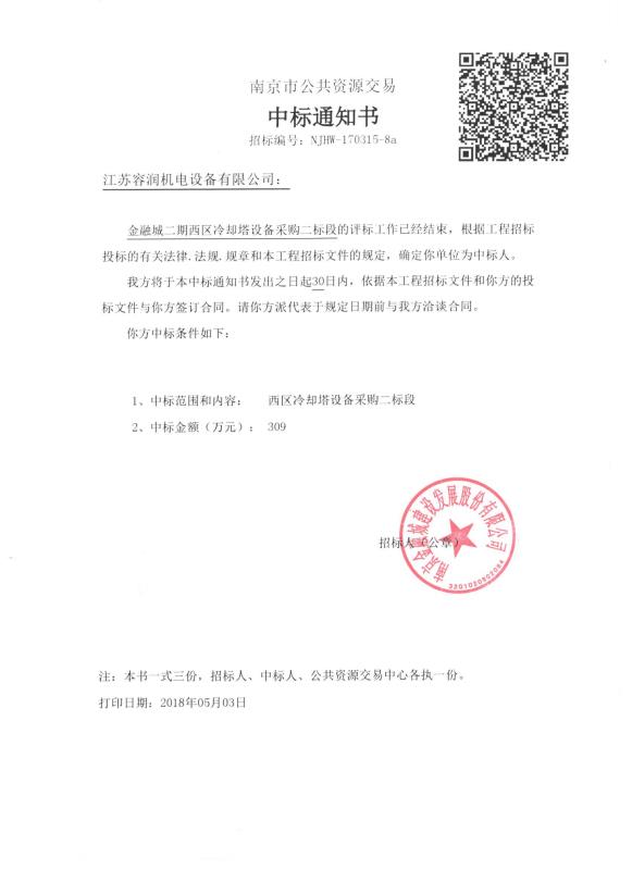 2018年5月3日,我司参加了由南京金融城建设发展股份有限公司组织的金融城二期西区冷却塔设备采购二标段工程招标会,公司以优秀的技术方案、完善的服务标准及合理的报价赢得了评标专家和招标方的肯定,顺利中标。项目中标对公司以后业务推广具有重要的意义,不仅展示了公司的实…